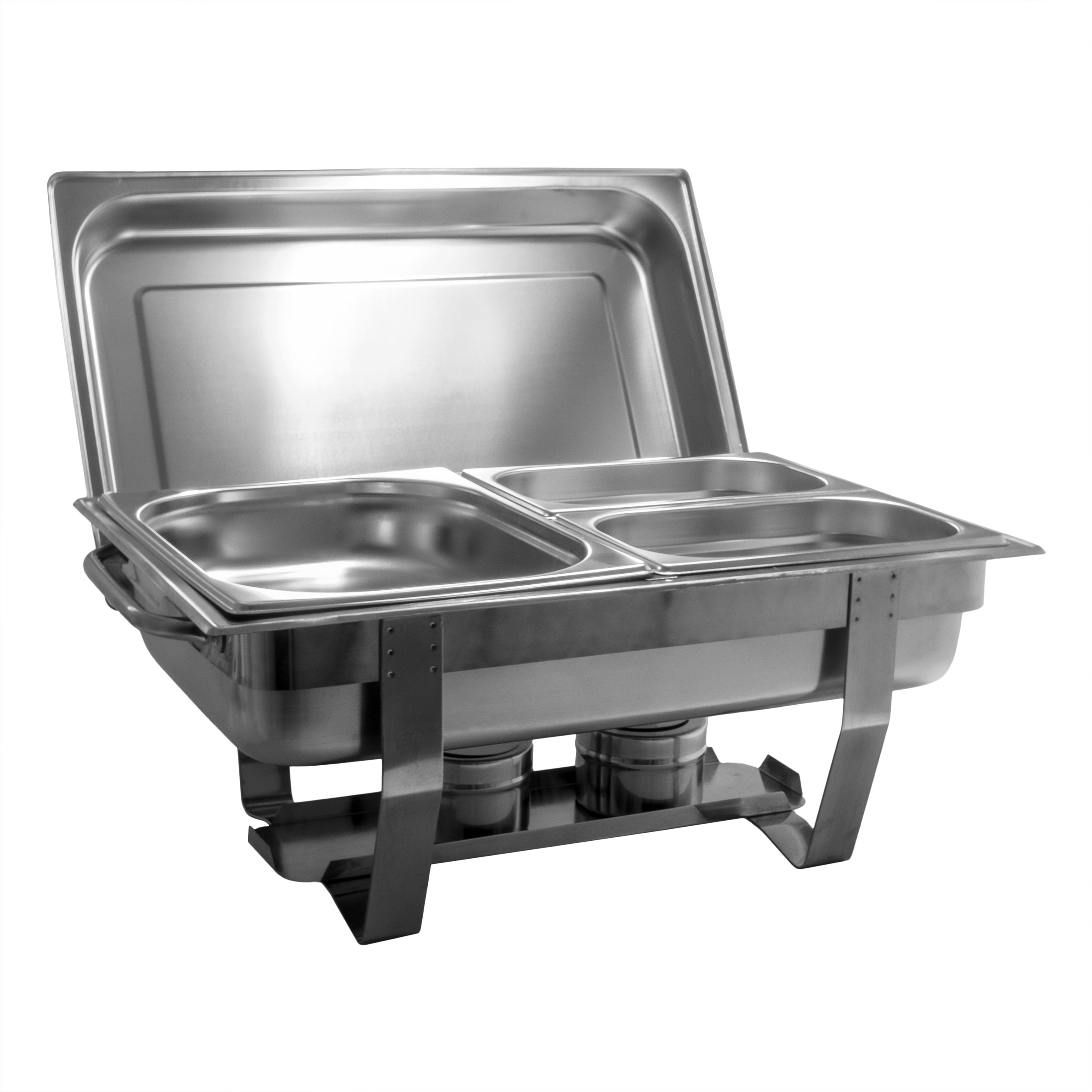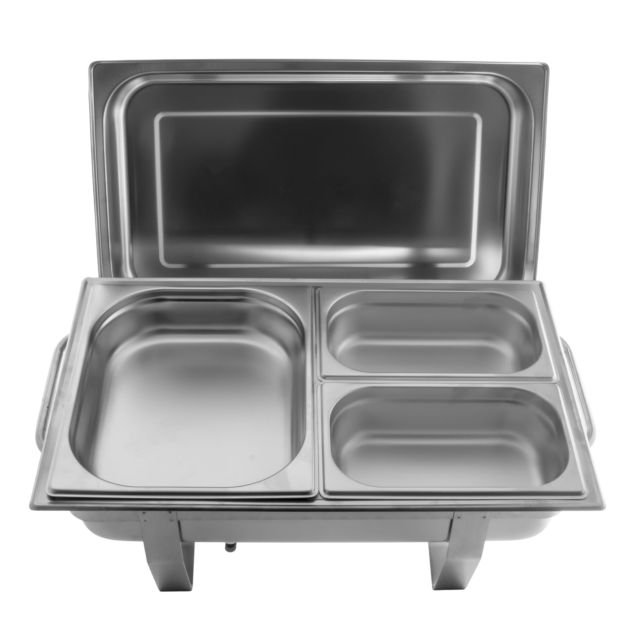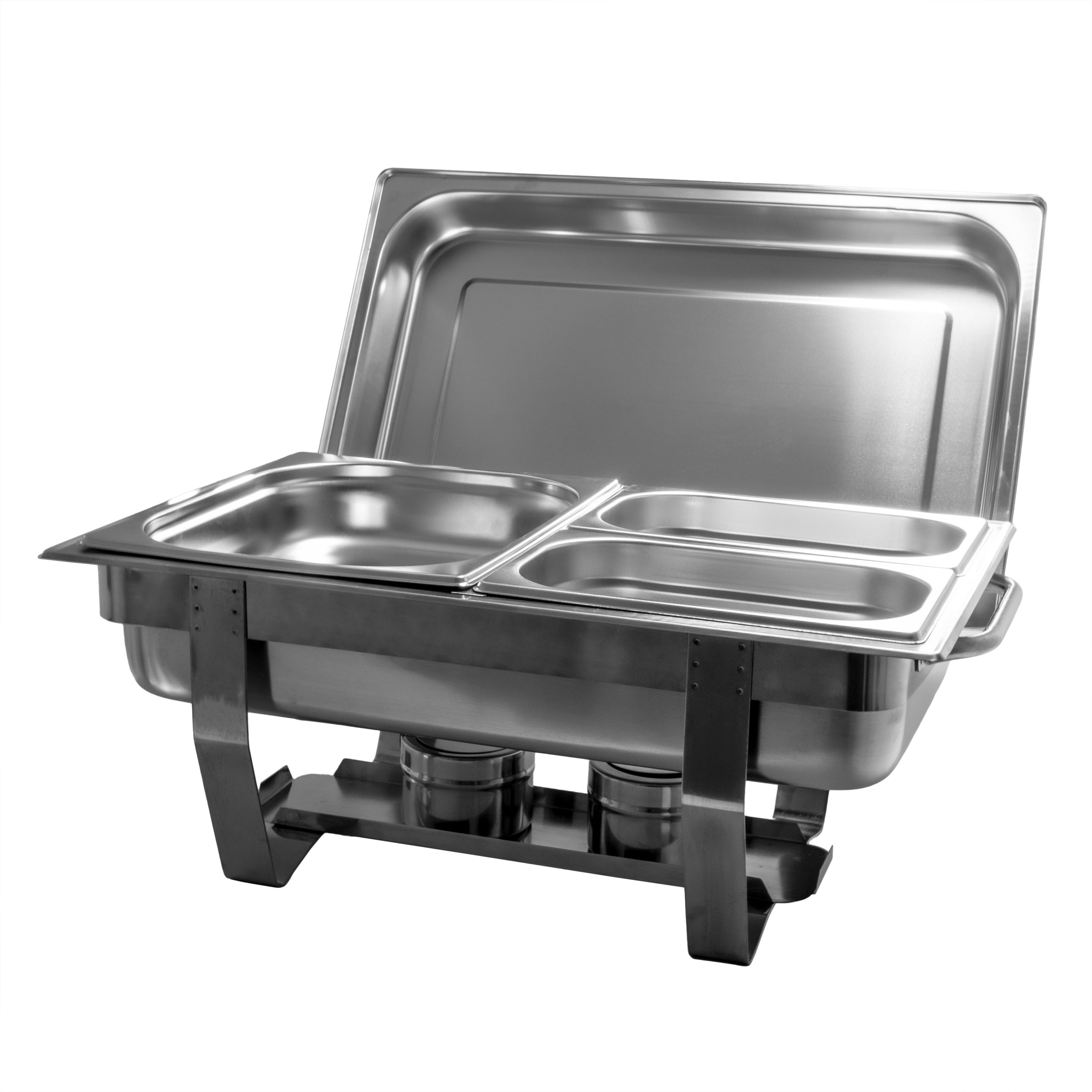 Mit diesem Chafing-Dish halten Sie Speisen am Buffet zuverlässig warm und präsentieren Fleisch, Beilagen, Gemüse und vieles mehr auf professionelle Weise. Die Behälter bestehen aus hochwertigem Edelstahl. Somit wird die Wärme gut geleitet und gleichmäßig verteilt. Auf Grund seiner glänzenden Silber-Optik wird das Gesamtbild jedes Buffets aufgewertet.