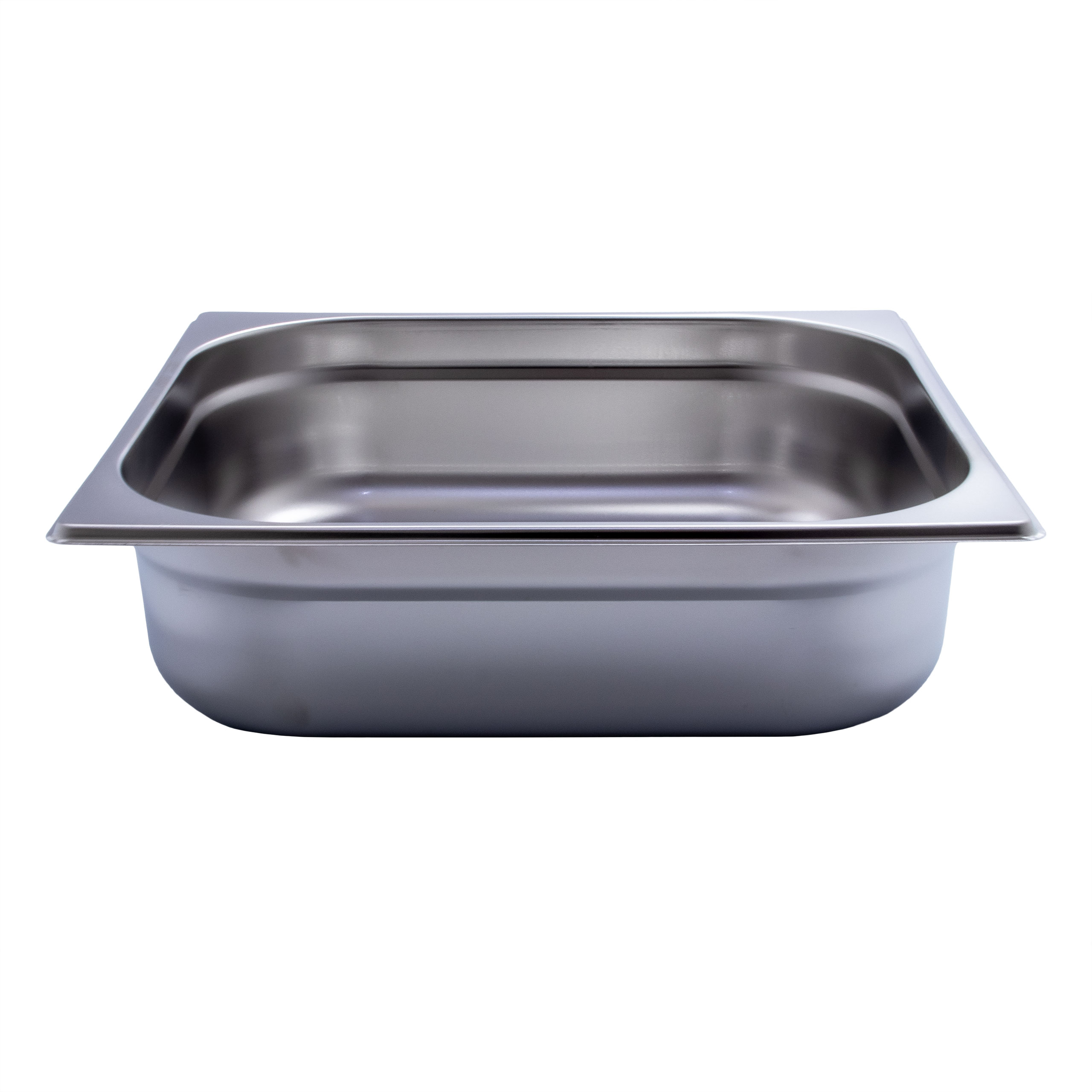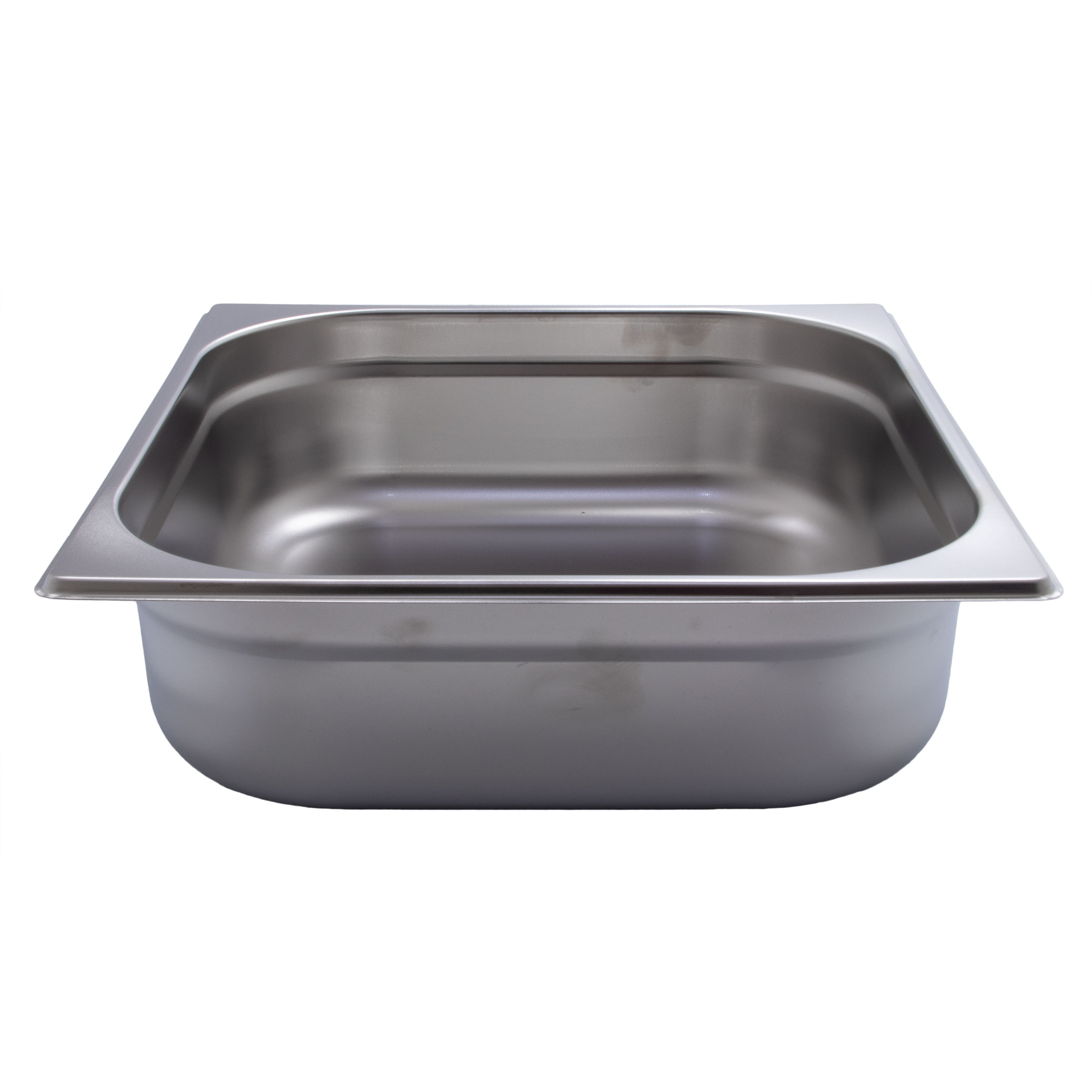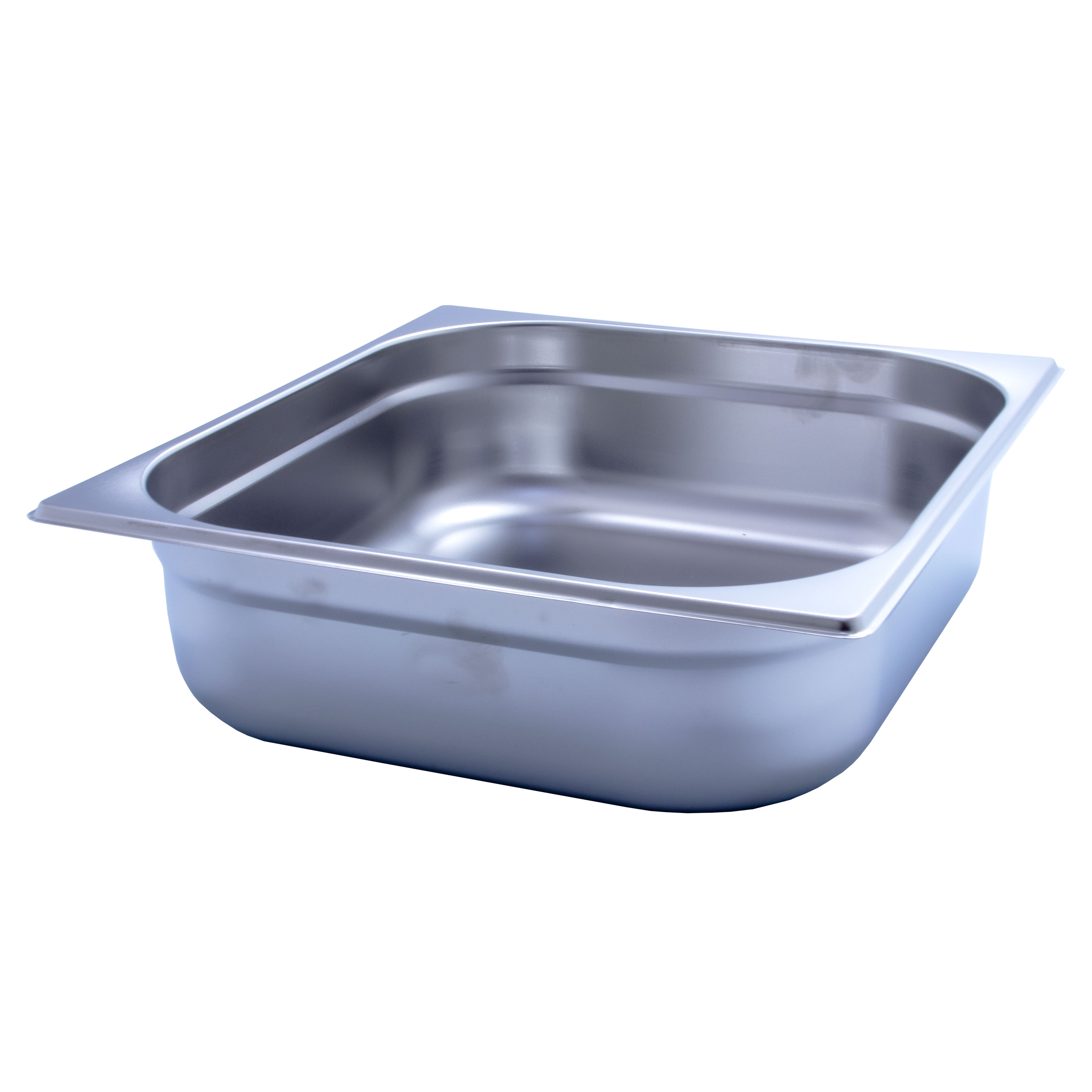 Gastronormbehälter GN 2/3 aus Edelstahl. Tiefe 100mm, Länge 355 mm, Breite 325 mm, 6,5 Liter, Materialstärke: 0,7mm. Die Behälter bestehen aus hochwertigem Edelstahl. Somit wird die Wärme gut geleitet und gleichmäßig verteilt. Auf Grund seiner glänzenden Silber-Optik wird das Gesamtbild jedes Buffets aufgewertet.