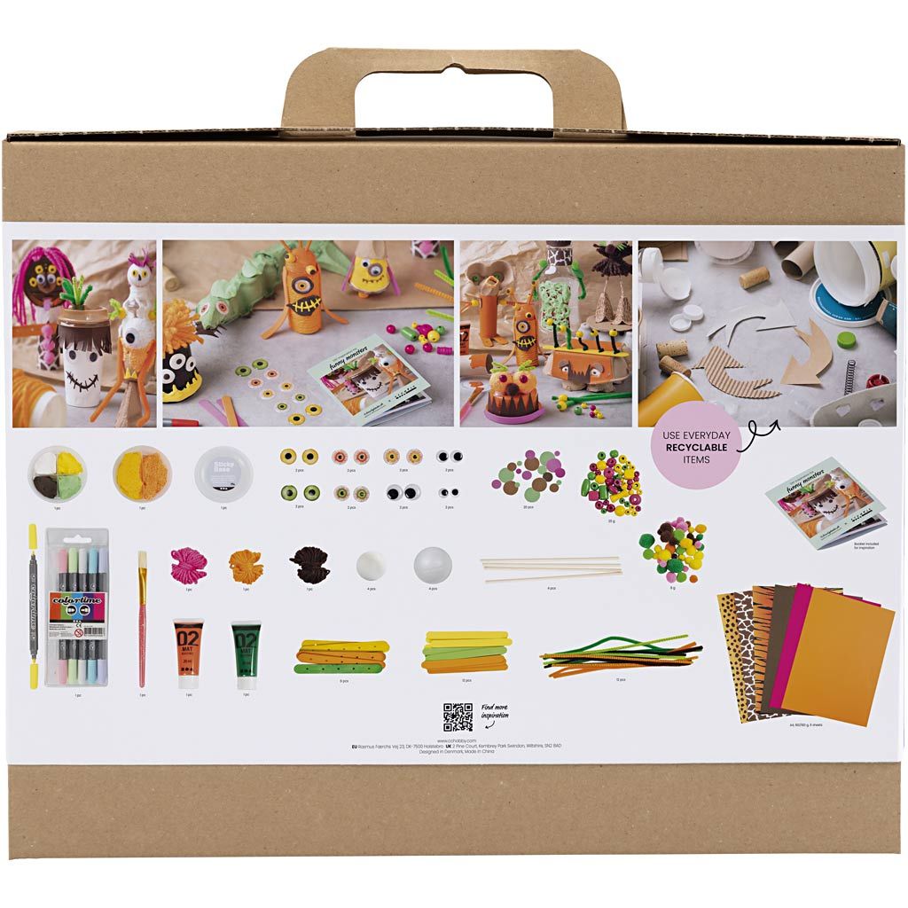 Mit diesem Mix können Sie mit Ihren Kindern viele lustige Monster basteln. Verwenden Sie die bereitgestellten Bastelmaterialien und kombinieren Sie sie mit recycelten Materialien, die Sie zur Verfügung haben. Folgen Sie unseren Vorschlägen oder lassen Sie Ihrer Fantasie freien Lauf.. Wollen Sie mit Ihren Kindern herrliche Recycling-Basteleien machen, dann ist dieses Maxi Kreativ Mix perfekt. Mithilfe von Bastelmaterialien und Recycling-Gegenständen darf der Fantasie freien Lauf gelassen werden und Kinder können ihre eigenen Monster erschaffen. Sammeln Sie Toilettenrollen, Eierkartons und andere Dinge, die normal im Abfall landen - und gestalten Sie wilde Monster mit großen Augen, lustigen Haaren und mit schönen Farben. Das einzige, das Sie zuhause haben müssen, ist eine Schere..