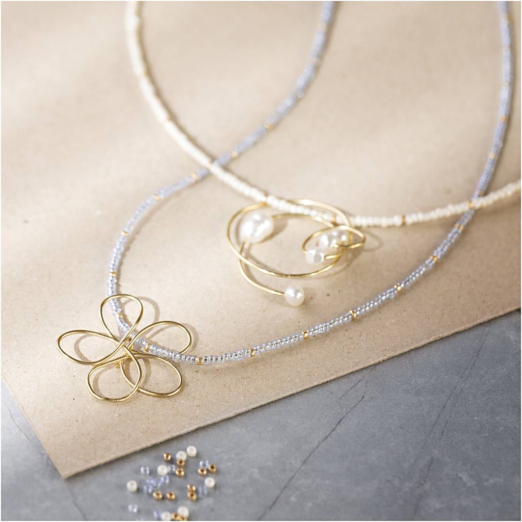 Mit diesem Set können Sie aus Schmuckdraht zwei Perlenketten mit eleganten Anhängern gestalten. Enthält alle Materialien und Anleitungen, die Sie benötigen. Alles, was Sie noch brauchen, ist eine Flachzange und eine Rundzange..