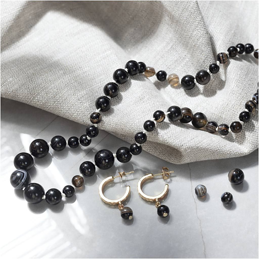 Begeistern Sie sich für einzigartigen Schmuck? Dann ist dieses Set genau das Richtige für Sie. Gestalten Sie Schmuck mit natürlichem Achat, einem wunderschönen Halbedelstein, der aus mehreren tausend Schichten besteht. Die Perle hat eine tiefschwarze Farbe – mit feinen weißen Streifen – und eine einzigartige Symbolik. Sie vermittelt ein Gefühl von Selbstvertrauen, Stärke und Intelligenz und eignet sich perfekt für alle, die innere Balance und Harmonie suchen..