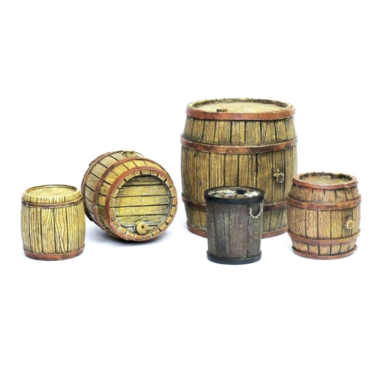 Fünf Holzfässer unterschiedlicher Größe und mit viel Liebe zum Detail, perfekt zum Aufstellen auf Fahrzeugen und für ländliche und städtische Umgebungen.