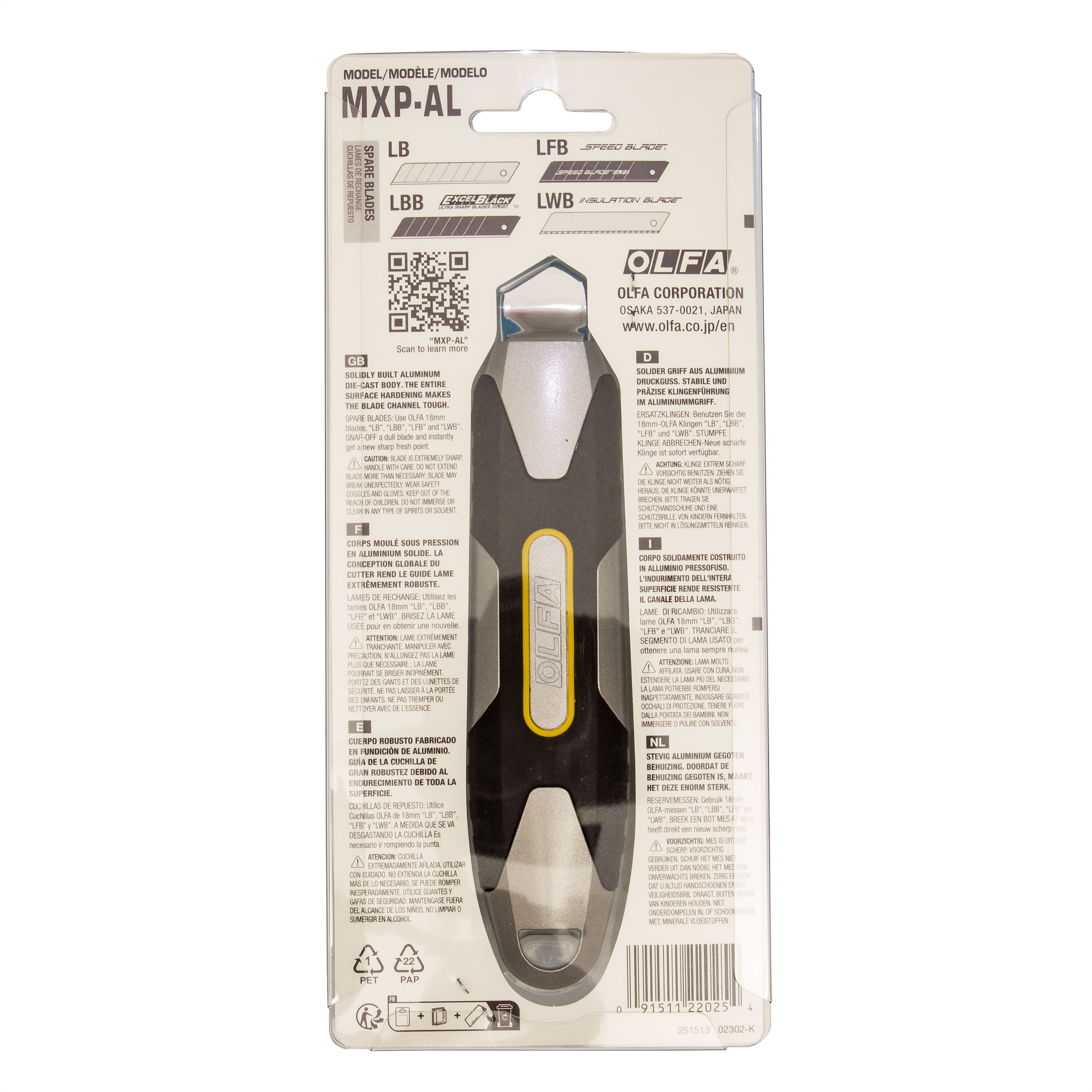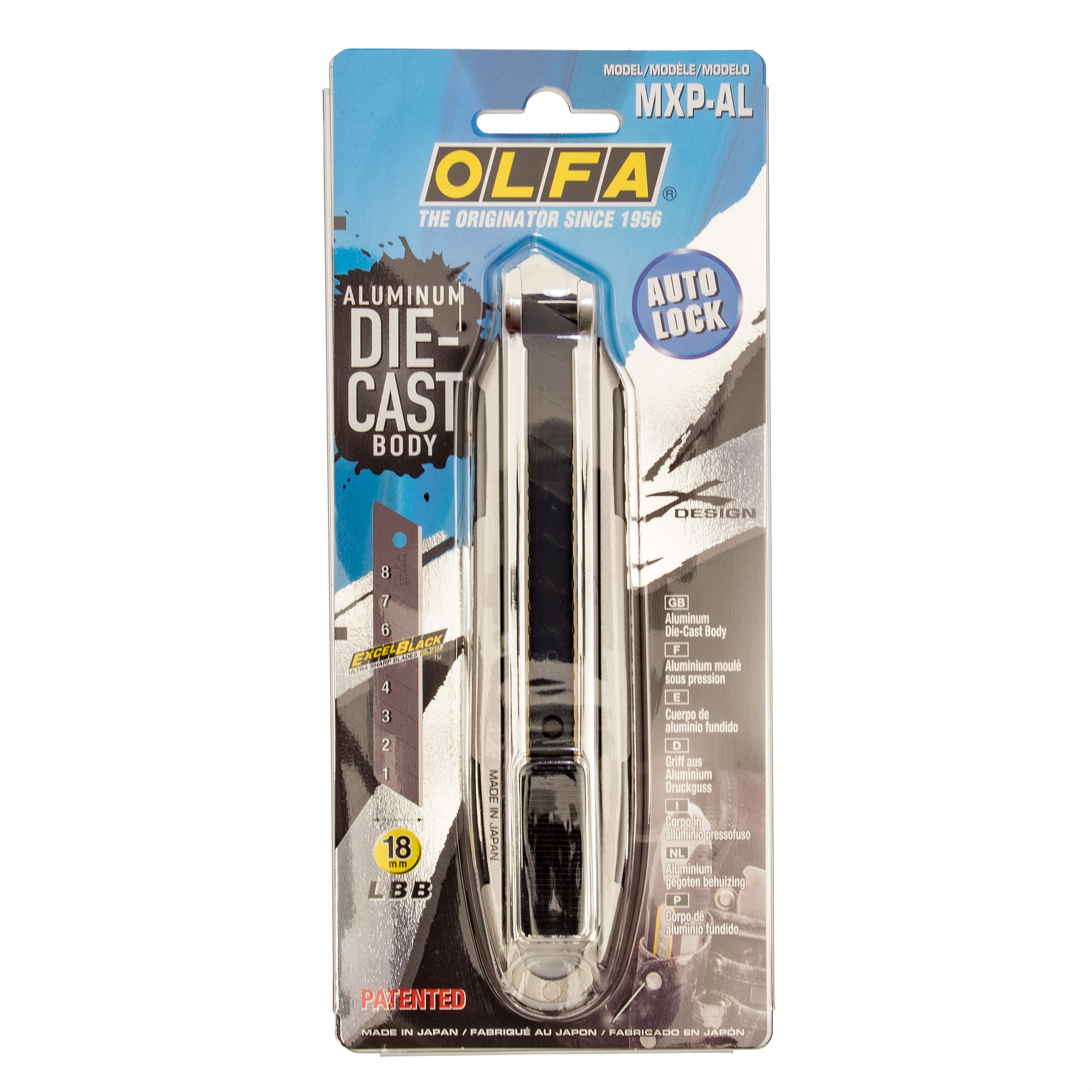 OLFA MXP-AL – 18-mm-Standardmesser. Luxus pur. Besonders robustes Gehäuse aus Aluminiumguss. X-förmiger Griff, rutschfester Elastomereinsatz und stabiler Polypropylen-Kunststoffrahmen. Der Griff wurde ohne Klebstoff gefertigt. Die Klinge aus rostfreiem, verchromtem Stahl zeichnet sich durch hohe Biegefestigkeit und Abriebfestigkeit aus. Schneller und sicherer Halt dank modernster automatischer Klingenverriegelung. Die große Öse am Griffende ermöglicht die einfache Aufbewahrung an der Werkzeugwand.