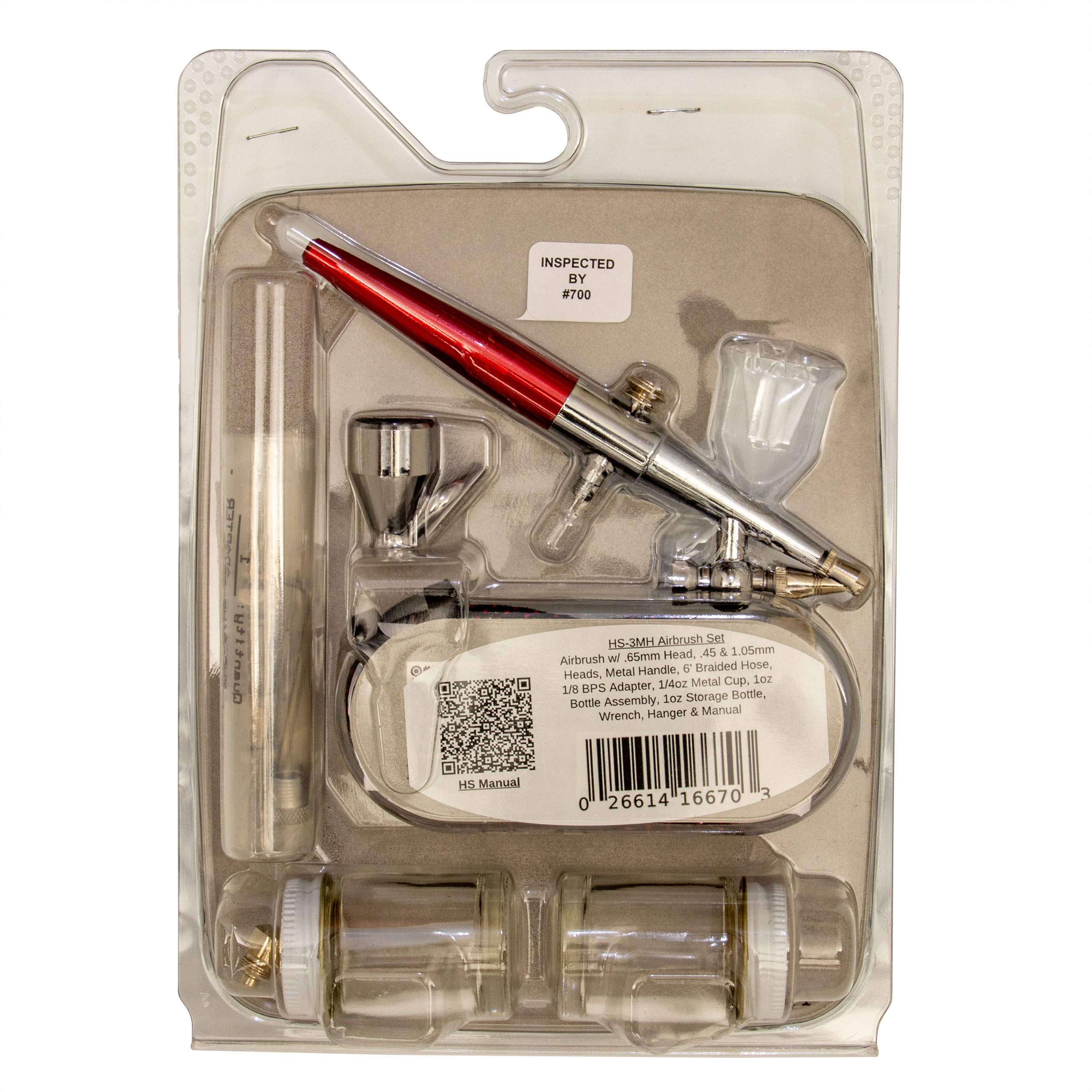 HS#3 Airbrush, Größe 1 & 5 Sprühköpfe, eloxierter Aluminiumgriff, 1/4 Oz Metallbecher, 1 Oz Sauganschluss mit Glas, 1 Oz Glas mit Deckel, Aufhänger, Schraubenschlüssel,